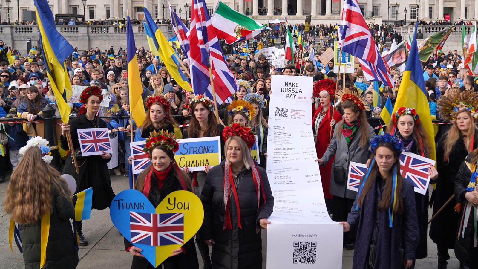 Elsewhere in the capital, large crowds gathered in Trafalgar Square to protest against President Putin’s aggression as protesters waved Ukrainian flags, chanting “Russia is a terrorist state”.