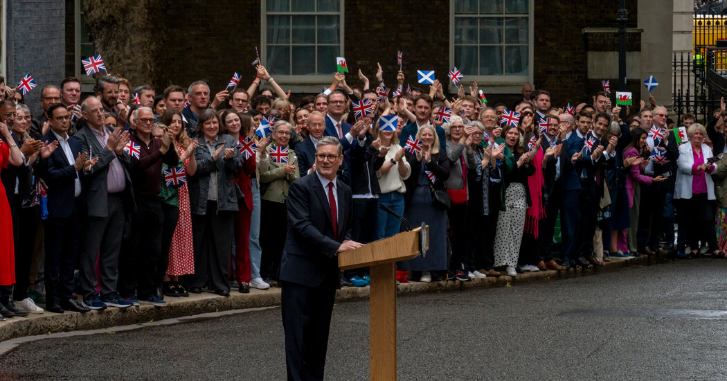 “You have given us a clear mandate, and we will use it to deliver change,” Mr. Starmer told cheering supporters after arriving at 10 Downing Street. “To restore service and respect to politics. End the era of noisy performance. Tread more lightly on your lives. And unite our country.”
