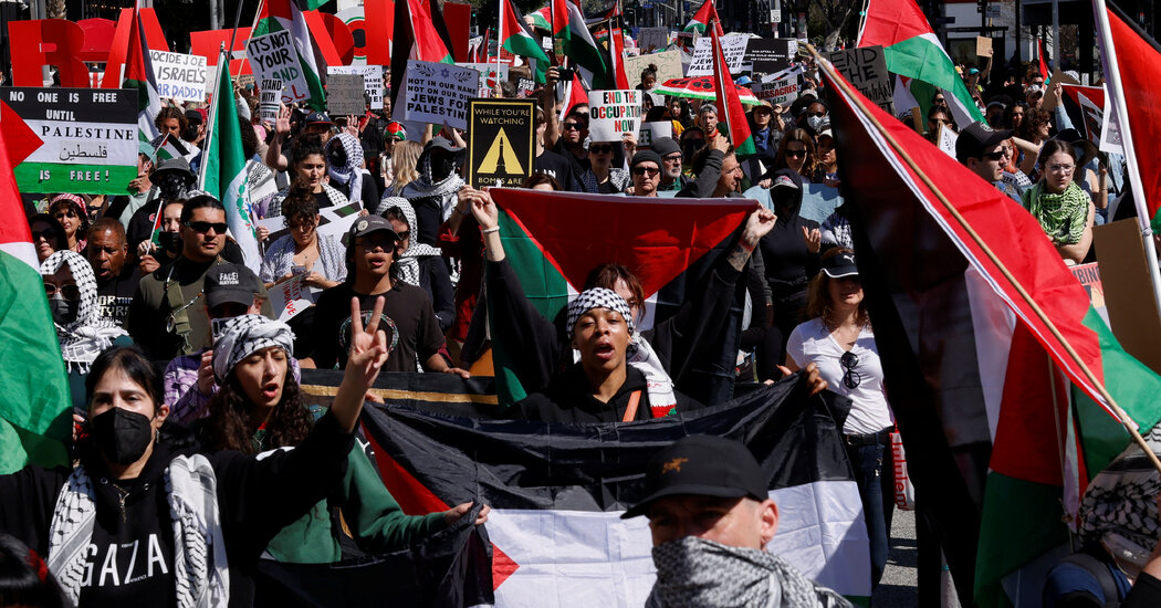 The Golden Globes, Emmys and Grammys included few references to the war, as celebrities grappled with how to express their views of the conflict. But some attendees at the Oscars, including the singer Billie Eilish and the actor Ramy Youssef, wore red pins that call for a cease-fire.