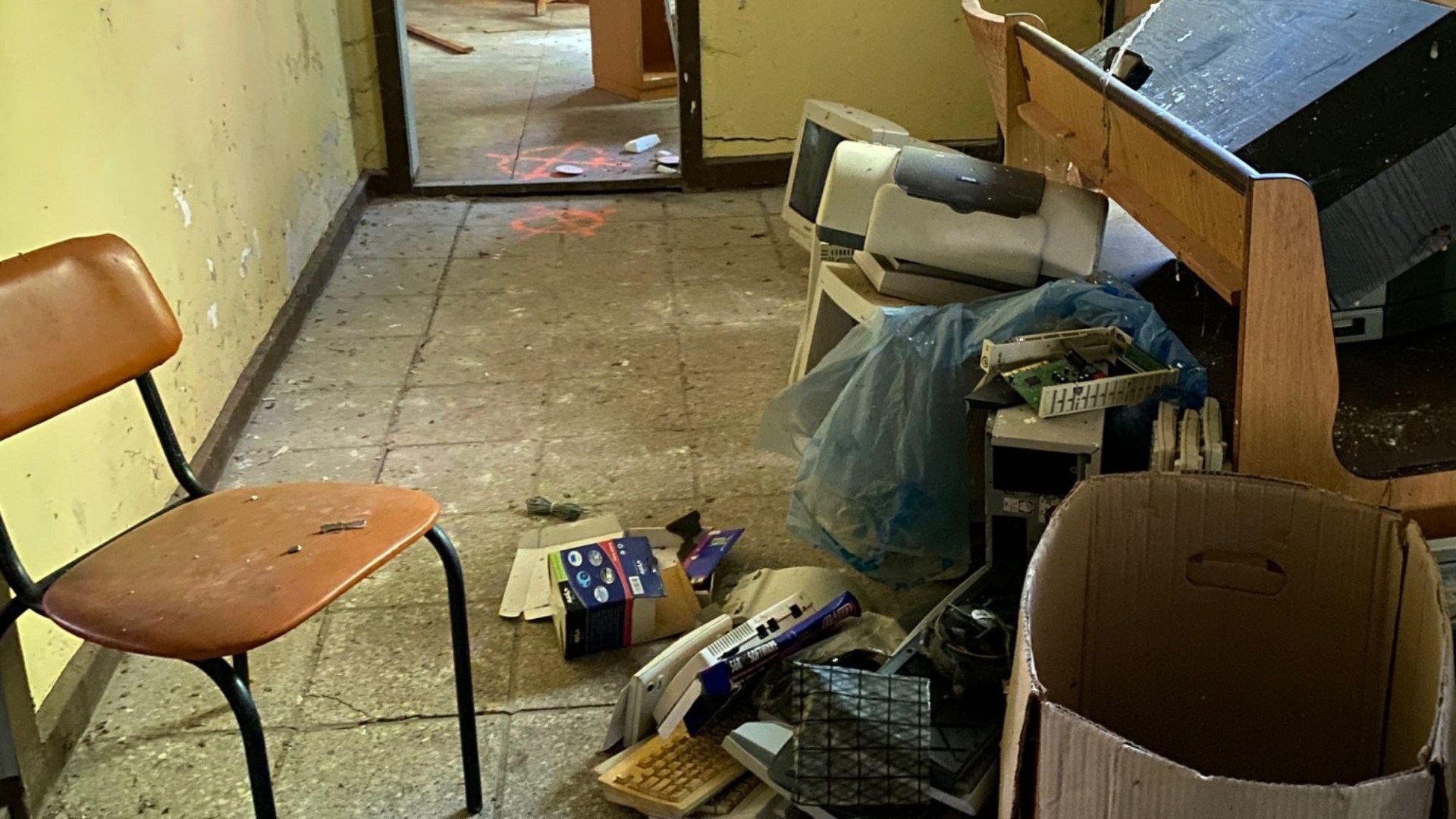 Throughout the building were also large circular symbols in an electric orange colour on the floor at the threshold of each section, probably sprayed by police as they finished inspecting a room.