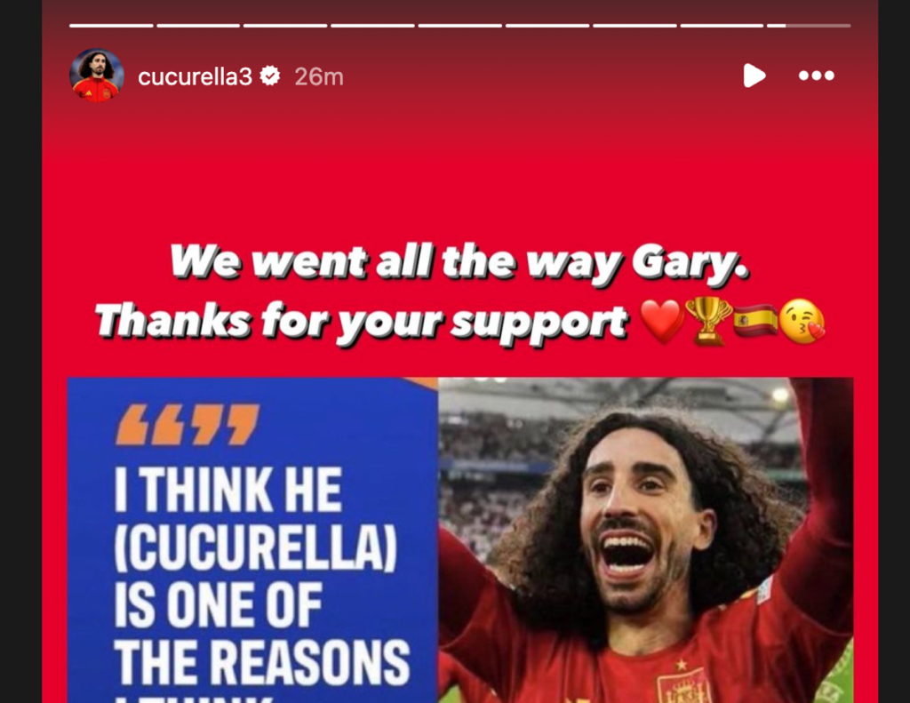 Afterwards, Cucurella posted Neville’s quote on Instagram alongside the caption: “We went all the way Gary. Thanks for your support,” accompanied by loveheart, trophy and Spanish flag emojies.