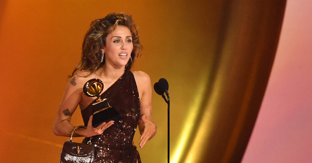 Miley Cyrus won the Grammy for record of the year on Sunday for the kiss-off anthem “Flowers,” her first win in the category.