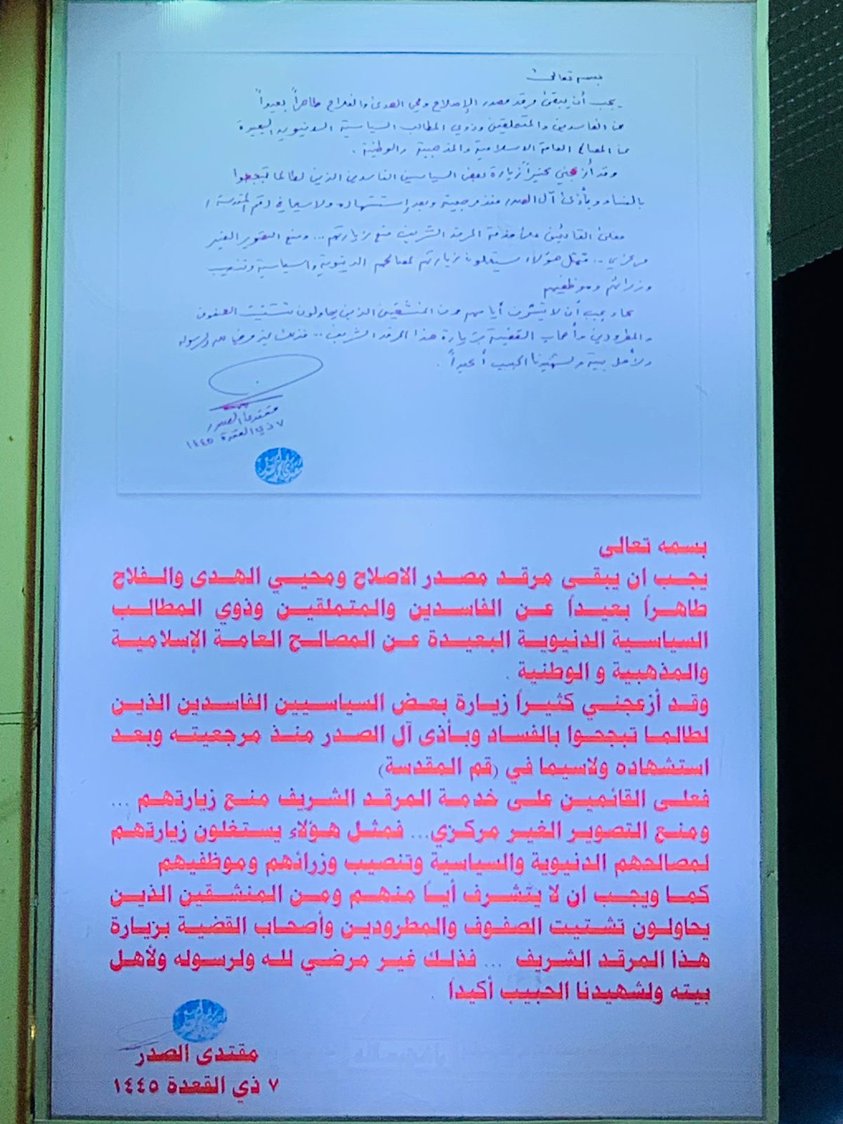 Najaf / NINA / The leader of the Sadrist movement, Mr. Muqtada Al-Sadr, directed to prevent the entry of “corrupt politicians, sycophants, those with political demands, dissidents, expelled people, and those with a cause to the shrine of the martyr Al-Sadr and his two sons.” And c