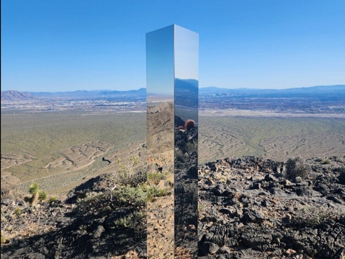 Jutting out of the rocks in a remote mountain range near Las Vegas, the glimmering rectangular prism’s reflective surface imitates the vast desert landscape surrounding the mountain peak where it has been erected.
