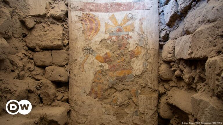 The pillared room unearthed at the Panamarca archaeological site contains a worn stone throne and elaborate wall murals portraying a powerful woman with a crown receiving visitors. The figure is further interlaced with a crescent moon and sea creatures.
