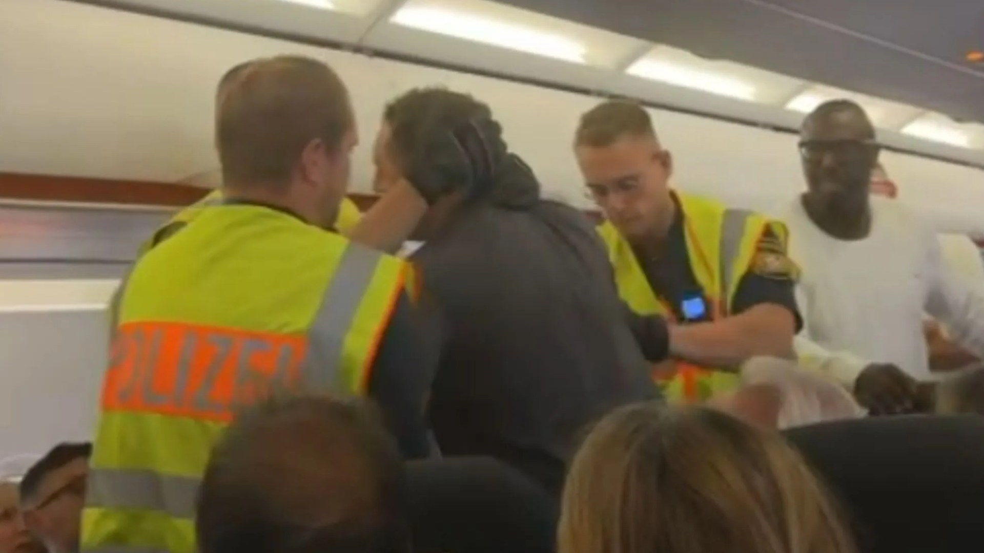 Police stormed the plane following the emergency landing in Germany on Wednesday and bundled the thug off the plane to riotous applause.