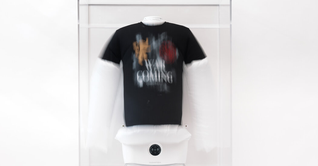 “Dungeon,” Denny’s fifth show with Petzel Gallery in New York, features a kind of heaving shrine to Grimes: Puffs from an automatic steamer inflate a black “Game of Thrones” T-shirt once owned by the star, installed in a Plexiglas case like a suit of armor. The sculpture is plugged into a power strip that Denny sourced from a liquidation sale at Twitter during its Musk-mandated transition to X.