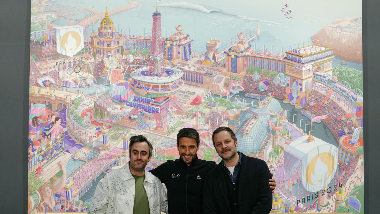 “I don’t want it to be something dull like only a poster with only a logo and a date on it, which they usually are. I want to tell a story,” Roncin told The Associated Press in an interview from the artist’s studio prior to the unveiling. “I want it to be something very happy, because it’s going to a huge party. I want it to be very joyful. Hopefully people will be inspired by these posters.”