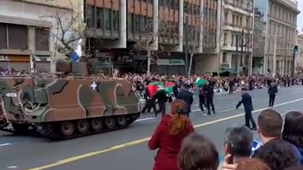 Pro-Palestinian protesters obstructed a military parade for Greece’s Independence Day, standing in the way of a tank and waving the Palestinian flag. Greece has been one of Israel’s leading European supporters during the war on Gaza.