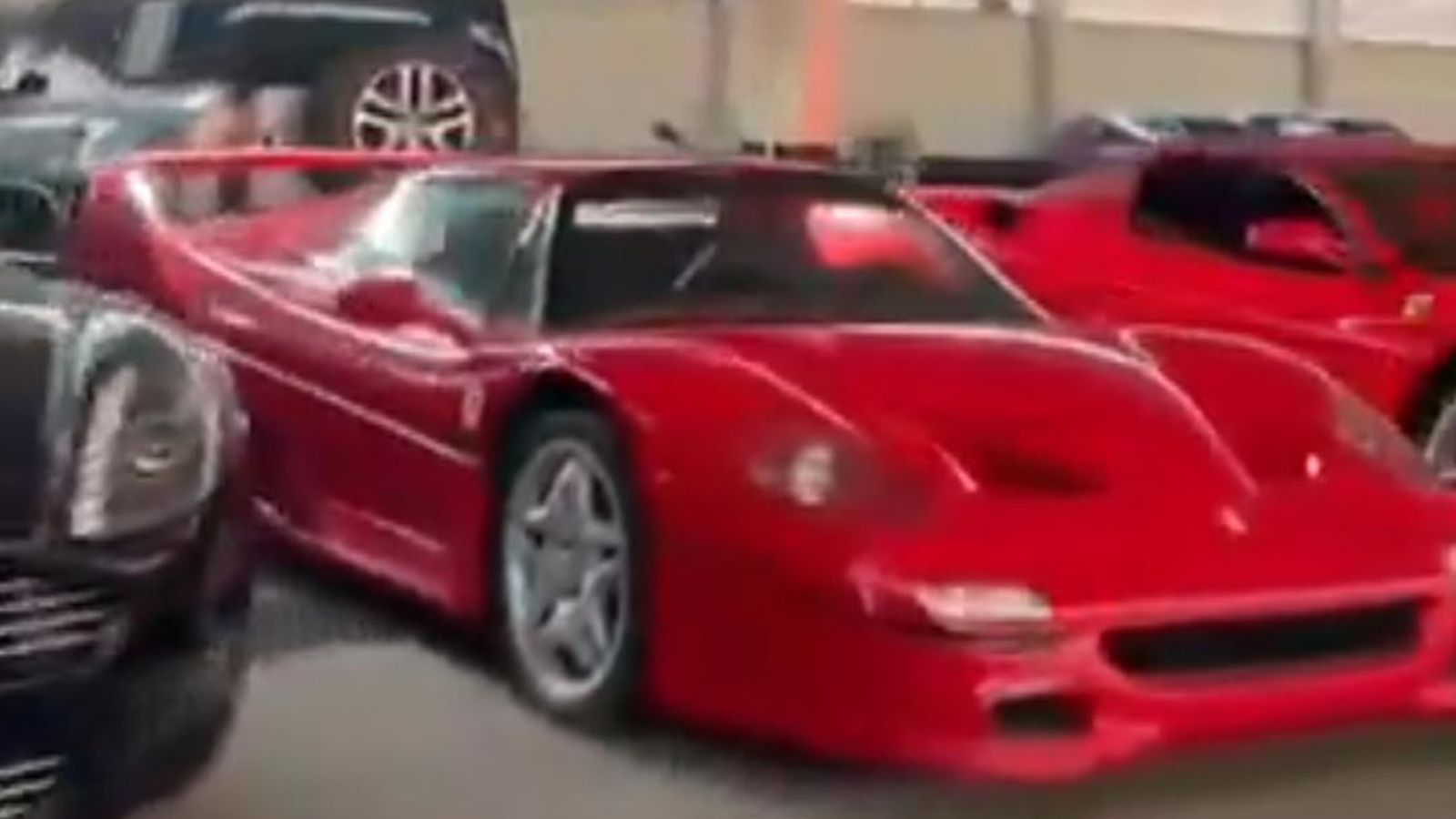 A more common Ferrari F430 Spider is also seen parked next to the F-50; with the video also appearing to show a Rolls-Royce Ghost, Bentley Continental GT, Aston Martin Rapide, Audi R8, and a Mercedes-Benz SLS AMG with gull-wing doors.