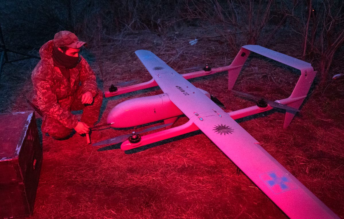 A Ukrainian soldier of 22nd Mechanised brigade prepares to start the Poseidon H10 Middle-range UAV at the front-line
