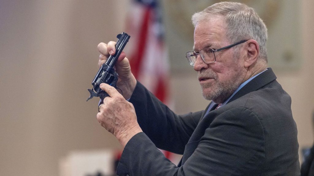 The jury watched a video of his experimentation with Baldwin’s gun, as the hammer was pulled back and released multiple times – and caught each time by a safety notch before it could strike the ammunition chamber to fire the gun.