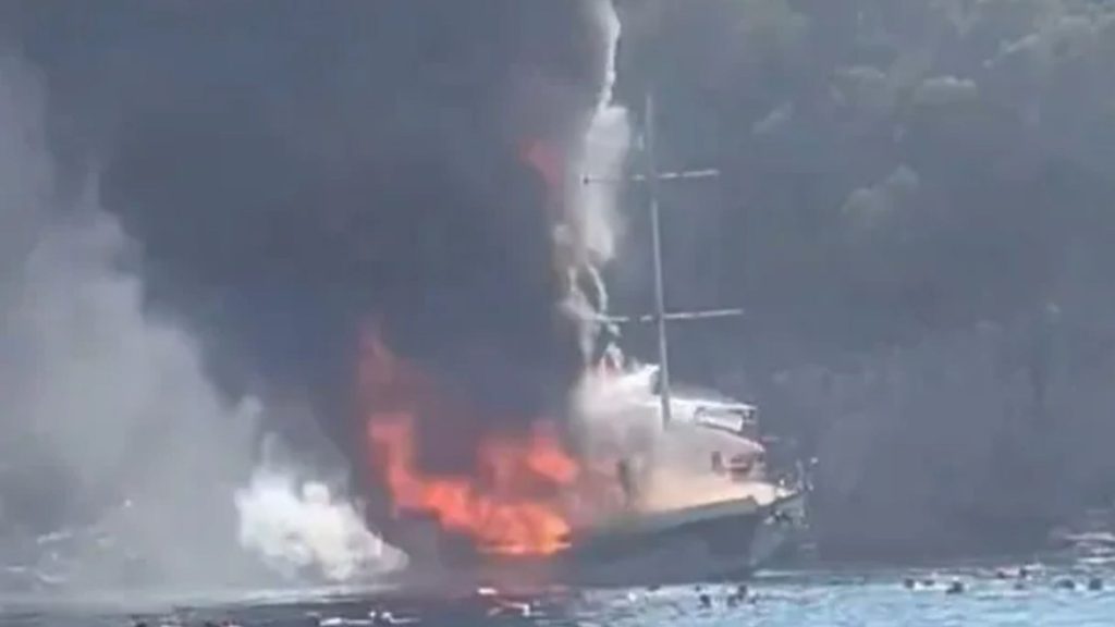 Dramatic footage shows the vessel engulfed in flames after it caught fire before sinking off the coast of Marmaris, Turkey.