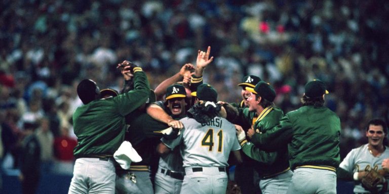 (Best photos of the Oakland Athletics celebrating after defeating the Giants to win the 1989 World Series: MLB via Getty Images)