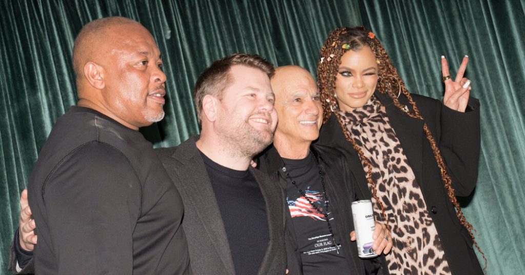 The evening ended with a live performance by the prolific record producer Timbaland that got Dr. Dre and Mr. Corden, who was fresh off a plane and incredibly jet-lagged, off their feet singing and dancing.