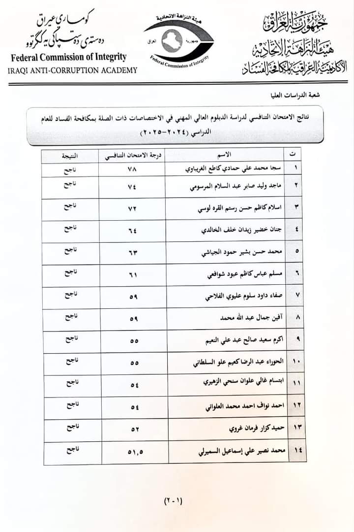 Baghdad / NINA / The Iraqi Academy for Combating Corruption in the Federal Integrity Commission announced the results of the competitive exam for studying the higher professional diploma in specializations related to combating corruption for the year 2019.