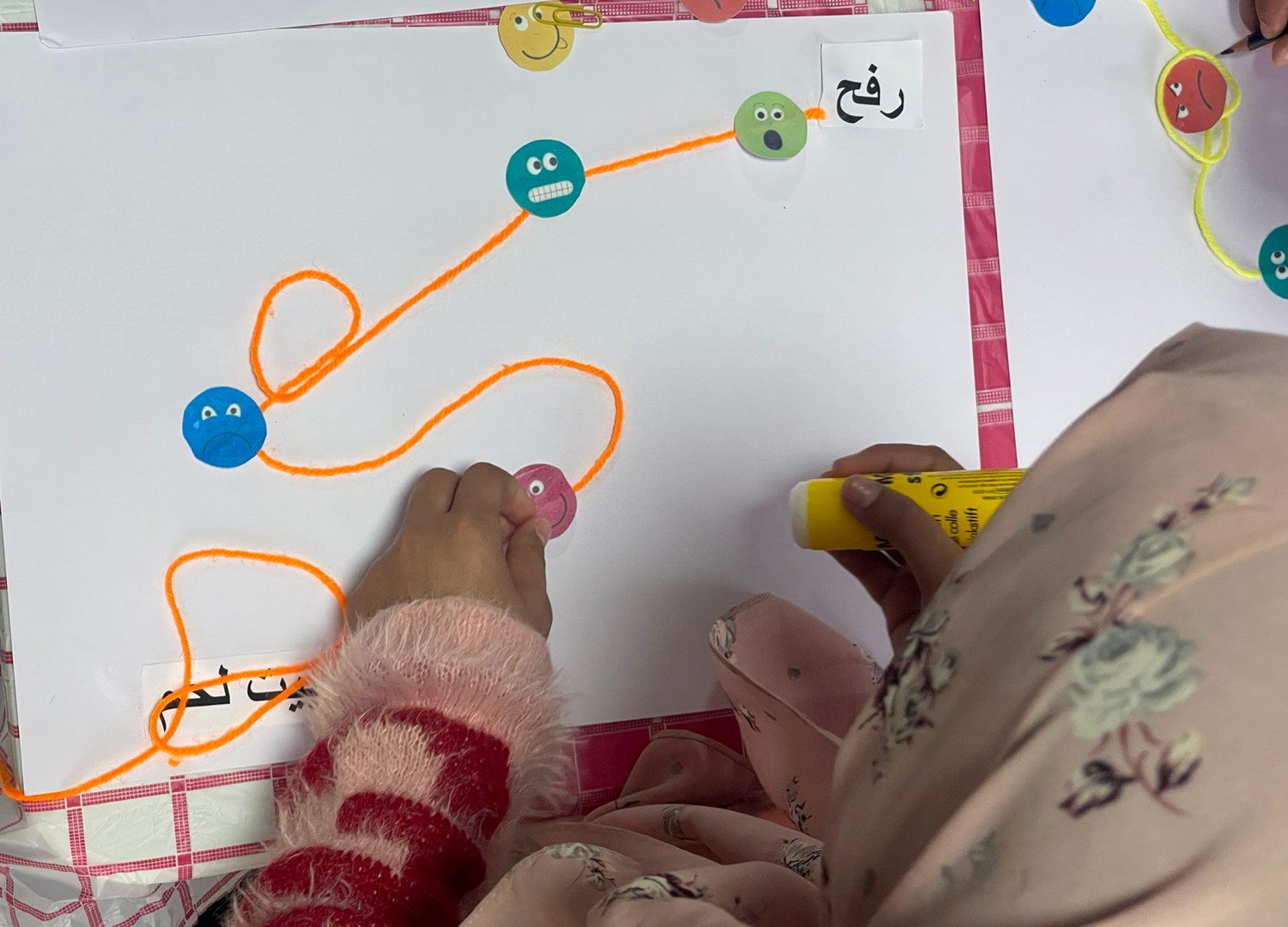 One girl was focused on cutting out the word “Rafah” and glueing it to a corner of her sheet with a sad, scared, frowning face glued sideways next to it.