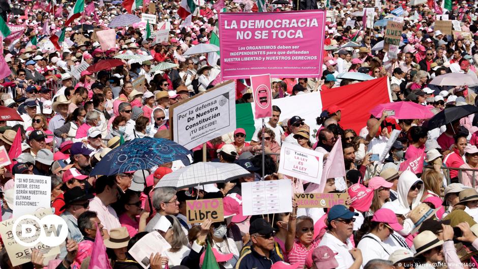 Demonstrators at the “March for Democracy” accuse President Andres Manuel Lopez Obrador, known as AMLO, of trying to weaken the authority ahead of an election in June.