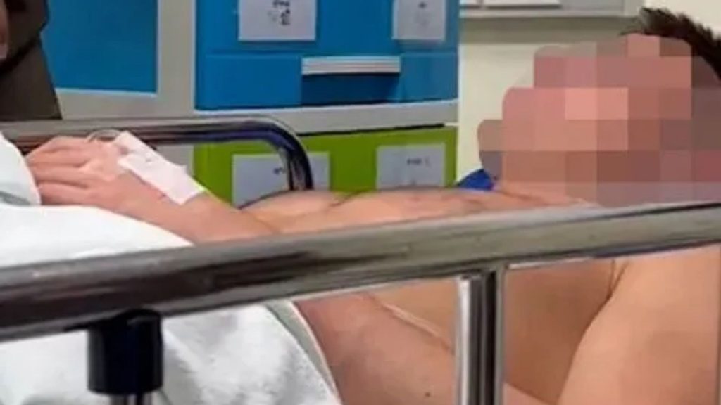 Today, a police chief was filmed visiting the knifed 23-year-old who told him: “My stomach hurts . . . I need stitches.”
