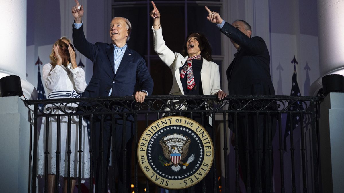 Biden was joined by his family, Vice President Kamala Harris and second gentleman Douglas Emhoff as they waved to crowds and watched the display from the balcony of the White House.