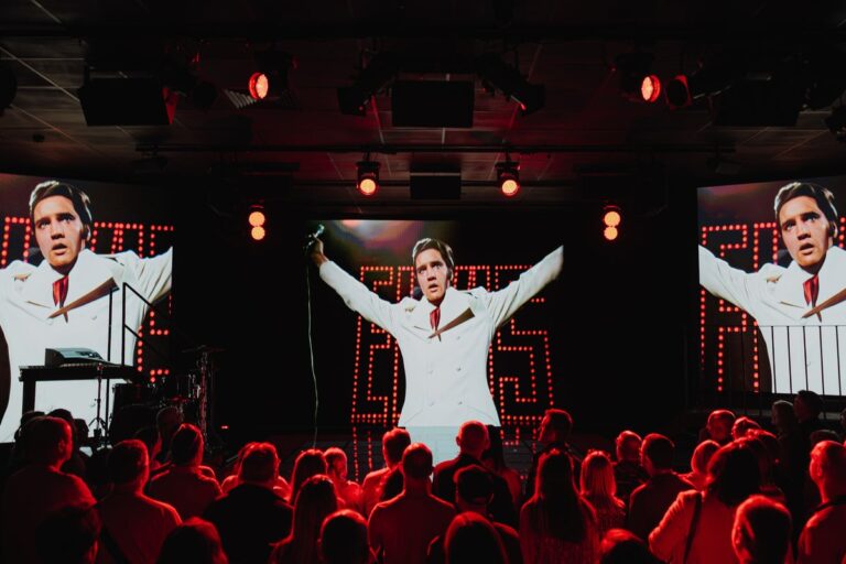 The first act takes you on a journey through Presley’s childhood in Tupelo, Mississippi. Audience members sit on rickety train benches (it’s a journey, get it?), guided by an actor playing his childhood pal, Sam Bell. After intermission at a Blue Hawaii-themed bar comes what is supposed to be the grand finale: a reconstruction of the King’s legendary 1968 TV comeback special. There’s a three-person live band – exemplary musicians doing their very best to revive a dying crowd – but no live actor playing Presley himself, and the focus is just “enhanced” footage from that famous televised gig.