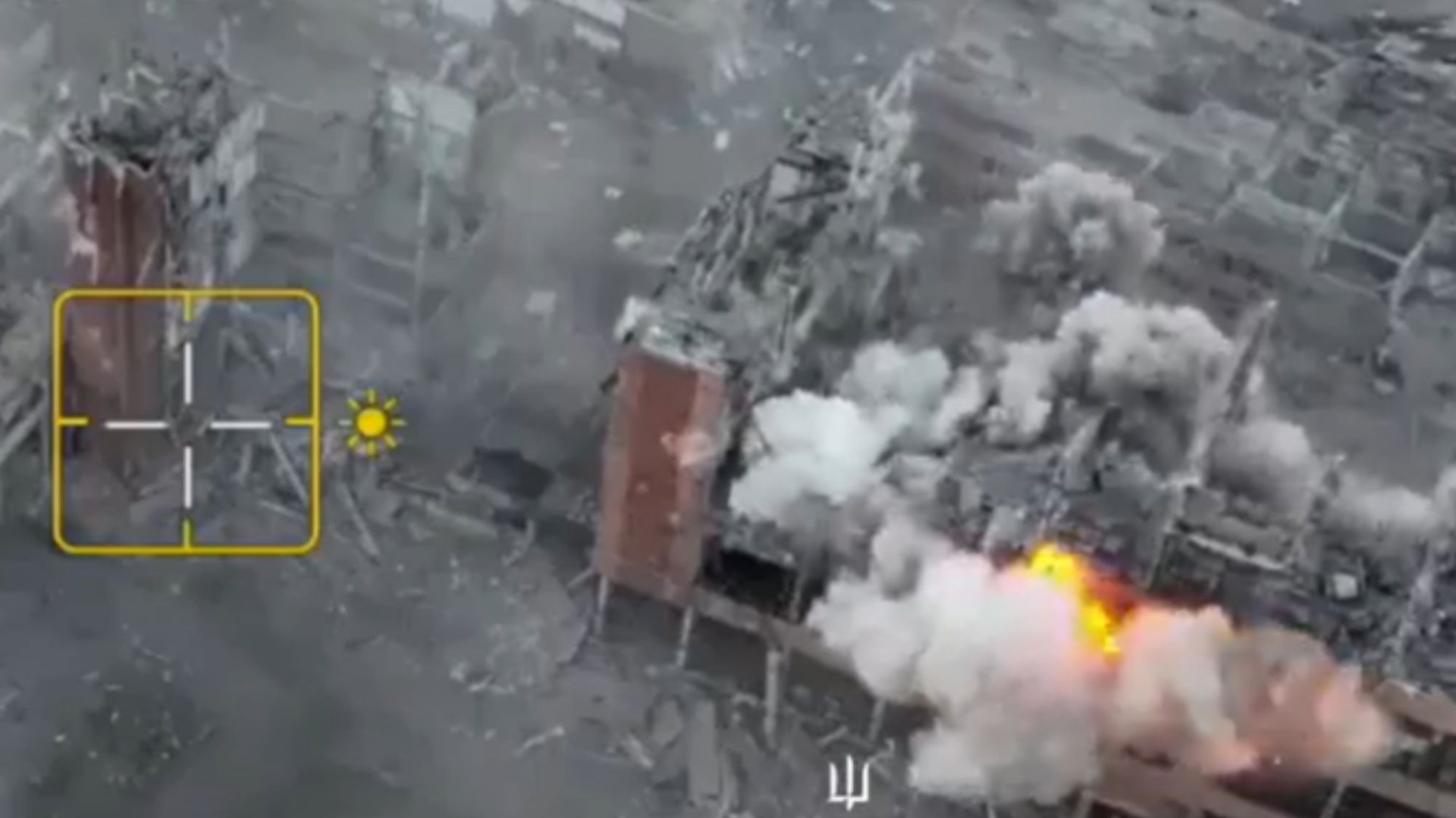 Incredible footage shows killer drones blasting at the fortification to let troops break in before wiping out huge chunks of buildings.