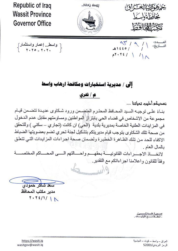 With the document.. The Governor of Wasit submits an official report to the intelligence to investigate the gangs that threaten citizens in the neighborhood district and prevent them from entering bids in the municipality.