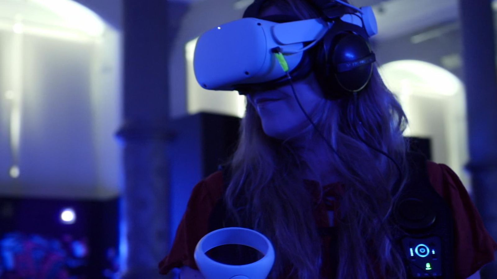 Users are fitted with a VR headset and a haptic suit which allows them to feel vibrations.