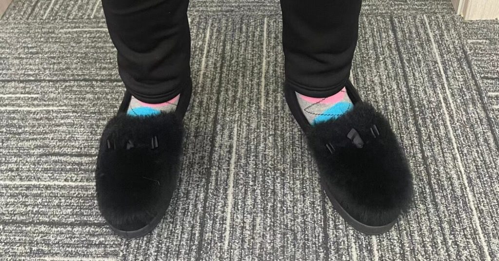 Ms. Chen was wearing a mango-yellow, hooded down overcoat with a white knit hat that covered her ears. On her arms were mismatched blue and beige sleeve covers adorned with cows. She wore black pants and pink-and-blue checkered socks with furry, granny-style loafers.