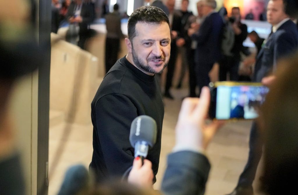 Ukrainian President Volodymyr Zelenskyy talks to reporters after a meeting at the Annual Meeting of World Economic Forum in Davos